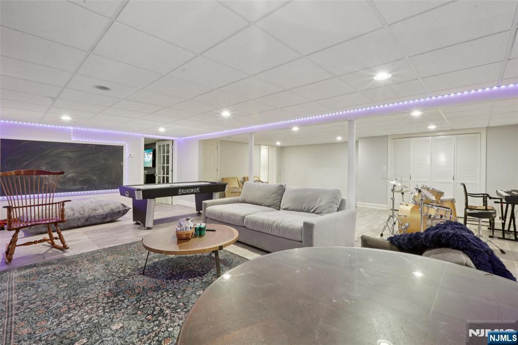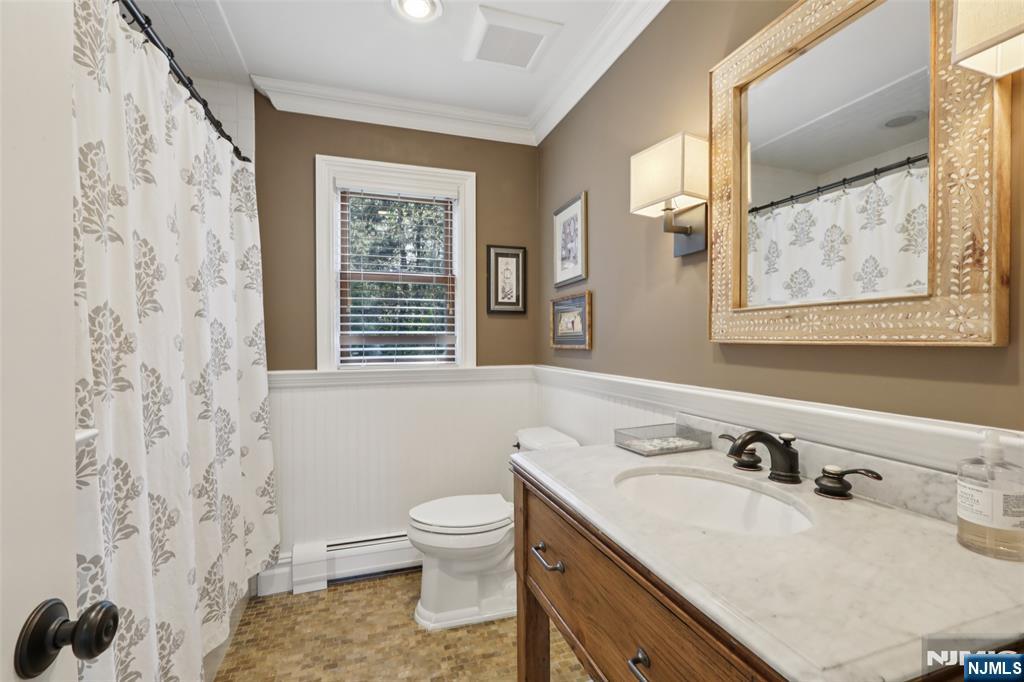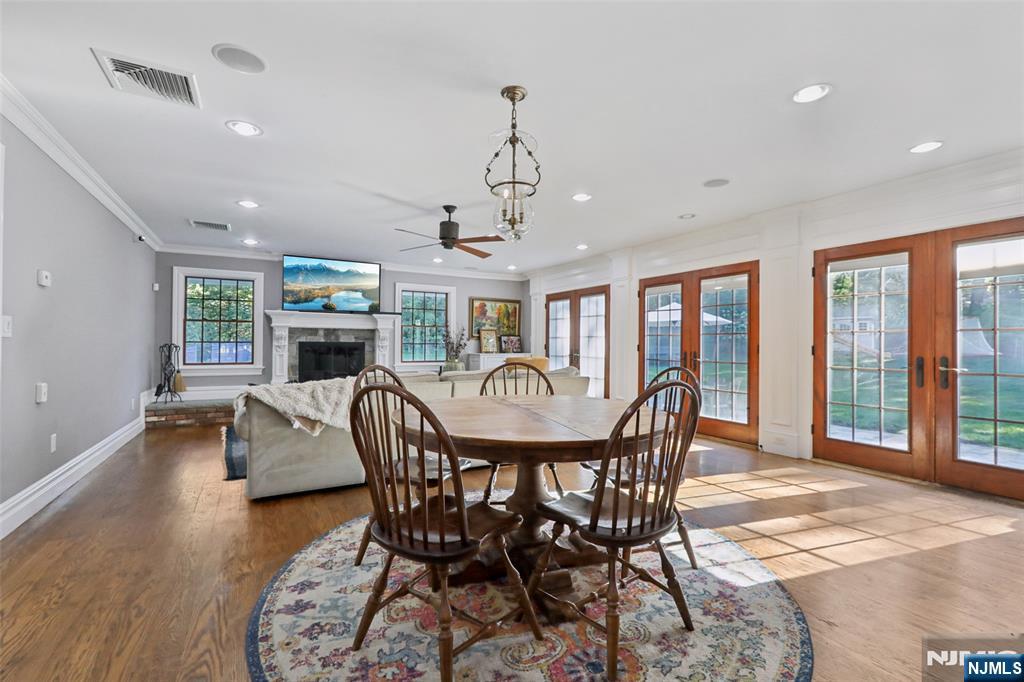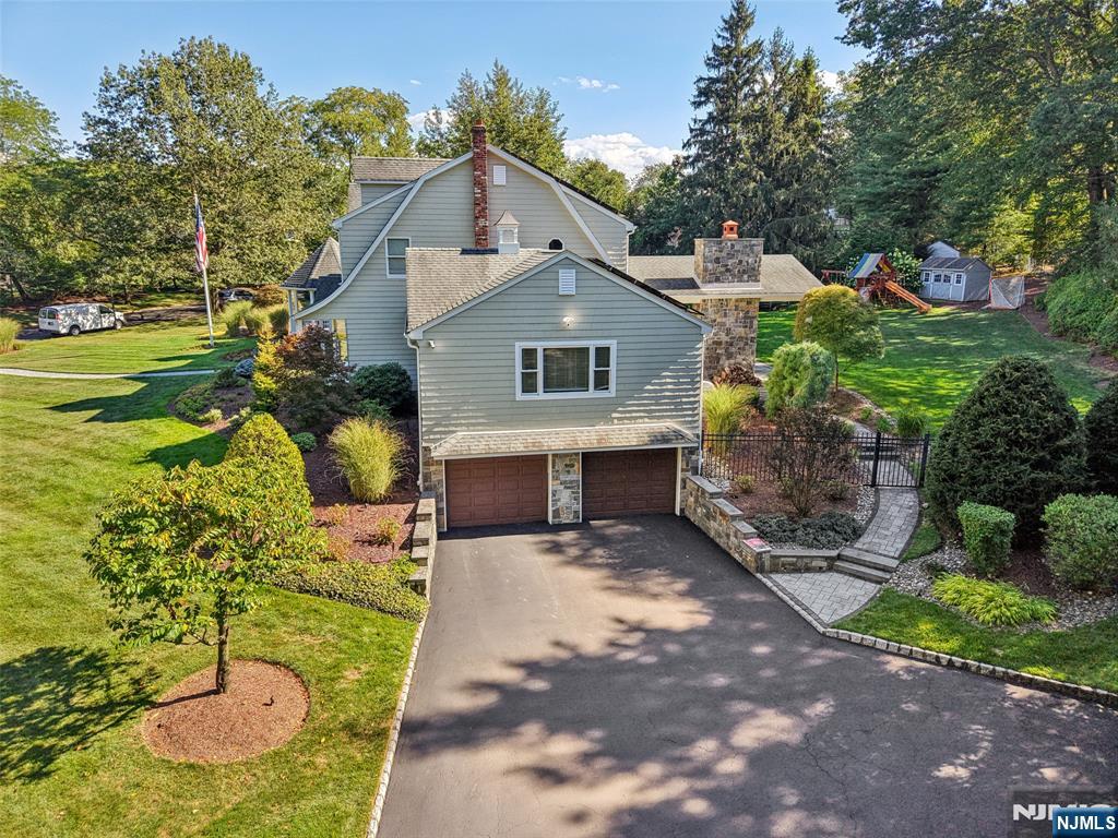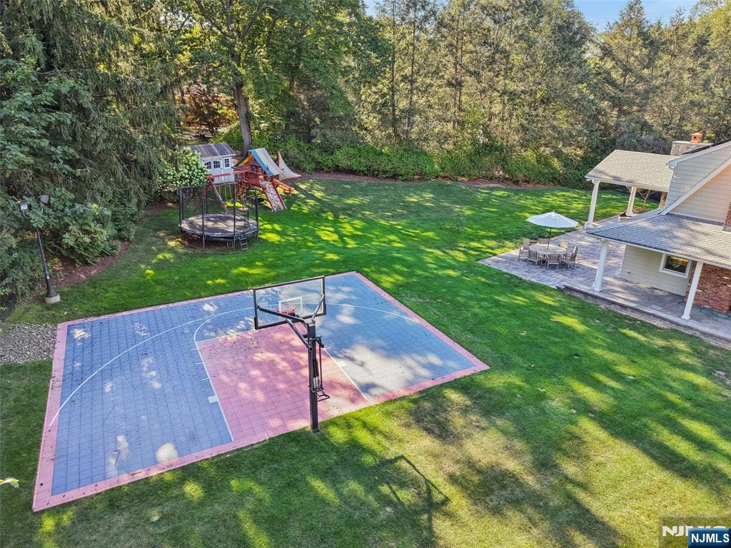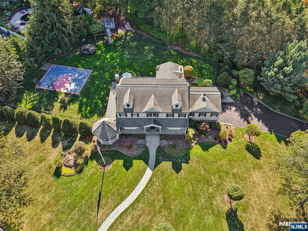 Pristine Center Hall Colonial, renovated from top-to-bottom in 2012, nestled on over an acre of picturesque grounds. This 5-bedroom, 3.5-bath home combines timeless curb-appeal and modern amenities, highlighted by a backyard that's perfect for entertaining, with expansive patios for outdoor dining, a vaulted-ceiling pavilion with a fireplace and built-in kitchen (2014), and a fenced yard with a basketball court. A wrap-around porch greets you to the bright 1st level with hardwood floors and quality millwork throughout, starting with a foyer flanked by a living room and formal dining room with coffered ceiling and wet bar. At the heart of the home is a gourmet eat-in kitchen, equipped with high-end appliances, marble countertops, and an oversized center island that opens to a family room with fireplace. A convenient 1st floor ensuite bedroom or home office, laundry room, and powder room complete the level. Upstairs, the primary suite impresses with a vaulted ceiling, large walk-in closet, and a spa-like bathroom. The finished basement offers plenty of recreation/living space, a gym, and mudroom access to the 2-car attached garage. Other highlights: radiant heated flooring in bathrooms, smart security & landscaping features, indoor/outdoor sound system, energy efficient features, and in a prime commuter town near Ho-Ho-Kus' NYC-bound train. Truly an exceptional property!