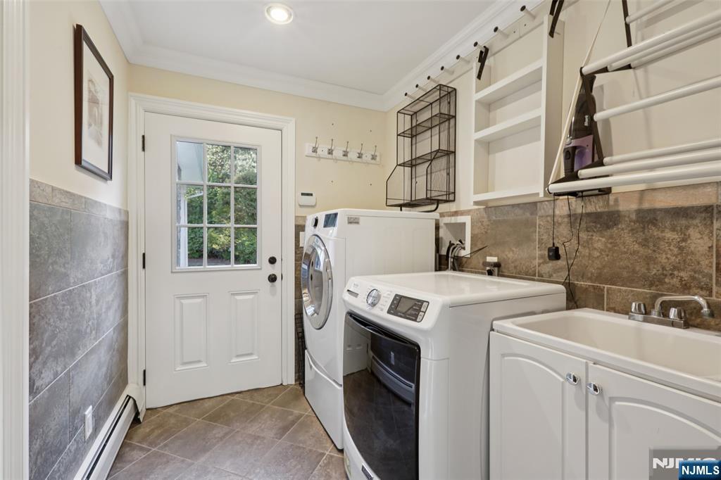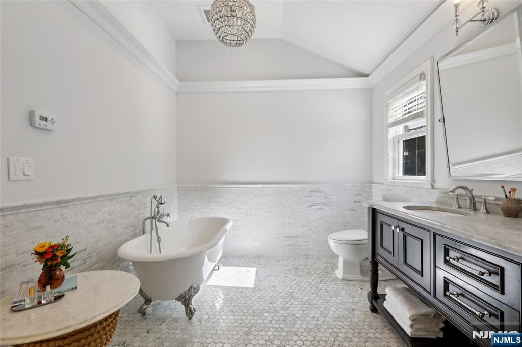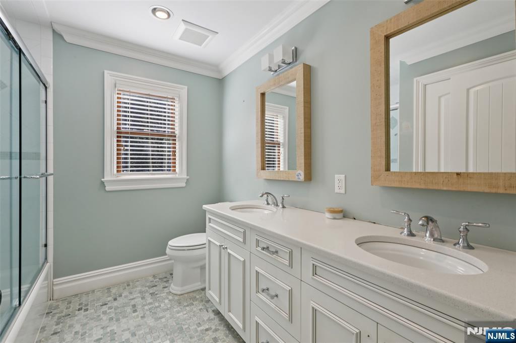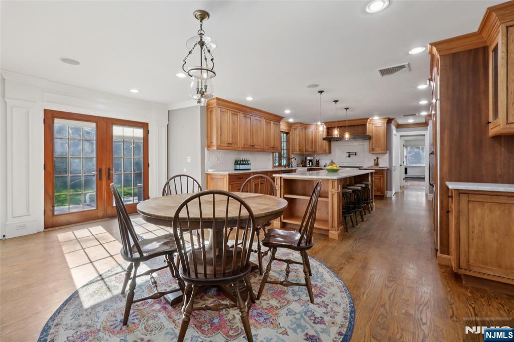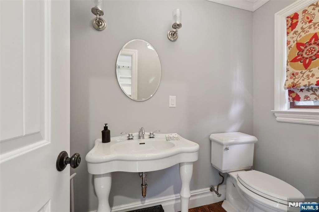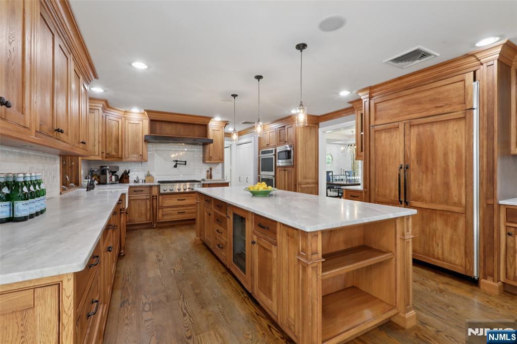 Pristine Center Hall Colonial, renovated from top-to-bottom in 2012, nestled on over an acre of picturesque grounds. This 5-bedroom, 3.5-bath home combines timeless curb-appeal and modern amenities, highlighted by a backyard that's perfect for entertaining, with expansive patios for outdoor dining, a vaulted-ceiling pavilion with a fireplace and built-in kitchen (2014), and a fenced yard with a basketball court. A wrap-around porch greets you to the bright 1st level with hardwood floors and quality millwork throughout, starting with a foyer flanked by a living room and formal dining room with coffered ceiling and wet bar. At the heart of the home is a gourmet eat-in kitchen, equipped with high-end appliances, marble countertops, and an oversized center island that opens to a family room with fireplace. A convenient 1st floor ensuite bedroom or home office, laundry room, and powder room complete the level. Upstairs, the primary suite impresses with a vaulted ceiling, large walk-in closet, and a spa-like bathroom. The finished basement offers plenty of recreation/living space, a gym, and mudroom access to the 2-car attached garage. Other highlights: radiant heated flooring in bathrooms, smart security & landscaping features, indoor/outdoor sound system, energy efficient features, and in a prime commuter town near Ho-Ho-Kus' NYC-bound train. Truly an exceptional property!