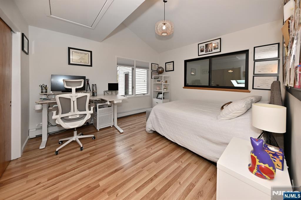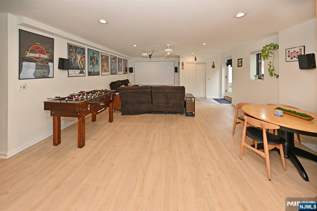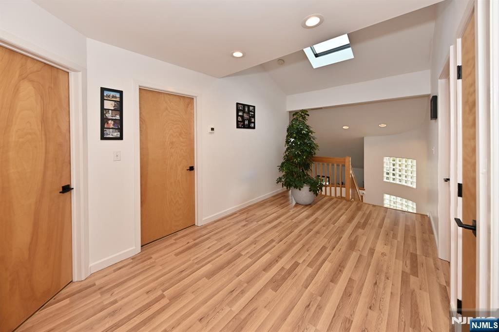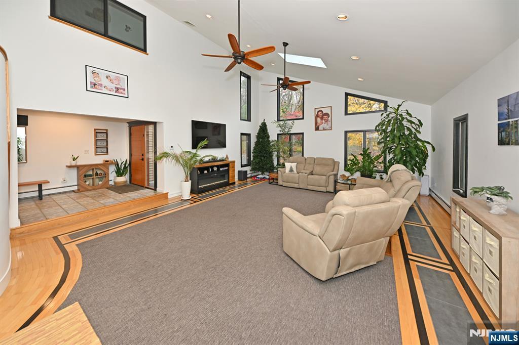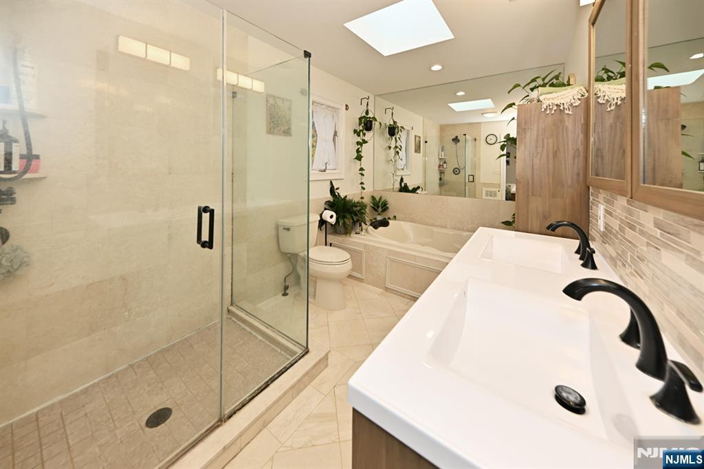 Incredible Contemporary Style home in Woodcliff Lake situated on a quiet street yet close to train, bus, shops and restaurants. Gorgeous, professionally landscaped grounds with specimen plantings, sprinkler system, detailed lighting, boulder rock walls and fully fenced rear yard. Deck offers large pergola with fans, lighting and gas grill. Updated roof, gutters, expanded and sealed driveway, new sheds, updated furnace and hot water heater. Main floor boasts an immense great room with clerestory windows and vaulted ceiling, large dining room opens to the spacious kitchen with center island. Laundry room is right off the kitchen, along with the powder room and access to the 2 car, heated garage. 2nd floor boasts a large open landing, primary bedroom offers a beautiful private terrace, walk-in closet, double door closet, beautiful primary bath with shower stall, double sinks and jetted tub. 3 additional spacious bedrooms and full bath. Lower level in beautifully finished with large rec room, serving station, powder room, storage room and walk out to side yard. The setting, location and detail to this home is amazing!!