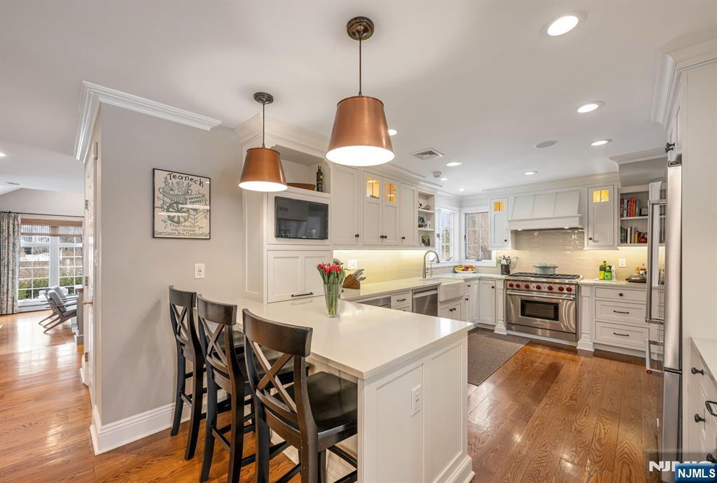 Welcome to this beautiful refined home nestled at the end of a quiet cul-de-sac in the heart of Glen Rock! Architectural charm abounds w/ vaulted ceilings, stone accents, & custom millwork in a warm yet elegant atmosphere, showcasing true pride of ownership throughout. The open-concept main level is designed for easy living & entertaining, featuring a custom chef’s kitchen that flows into the dining room, living room, and family room, w/ a dedicated home office for modern lifestyles. Additional highlights of the 1st fl include 2 fireplaces, a mud room, powder & laundry rooms, and an attached garage w/ a 2nd mudroom for daily convenience & functionality. Upstairs are 4 well appointed bedrooms, including a primary suite w/ dual custom walk-in closets & a spa-like bathroom w/ double vanity & steam shower, a junior en-suite, plus 2 add'l bedrooms & a hall bath w/ dual entrance. The finished lower level offers generous living space w/ high ceilings, a temperature controlled wine cellar, gym, powder room, and a large rec room. Extra features include a whole house generator, multi-zone AC & Heat, and reverse osmosis water filtration system. Outside, enjoy a fully fenced yard w/ multiple patios - perfect for entertaining or quiet relaxation. Ideally located near Glen Rock’s acclaimed blue ribbon schools, charming downtown, & NYC commuter train. This home offers an exceptional blend of elegance, comfort, and convenience. Listed by Romy Ouziel with the Wein Agency 917-922