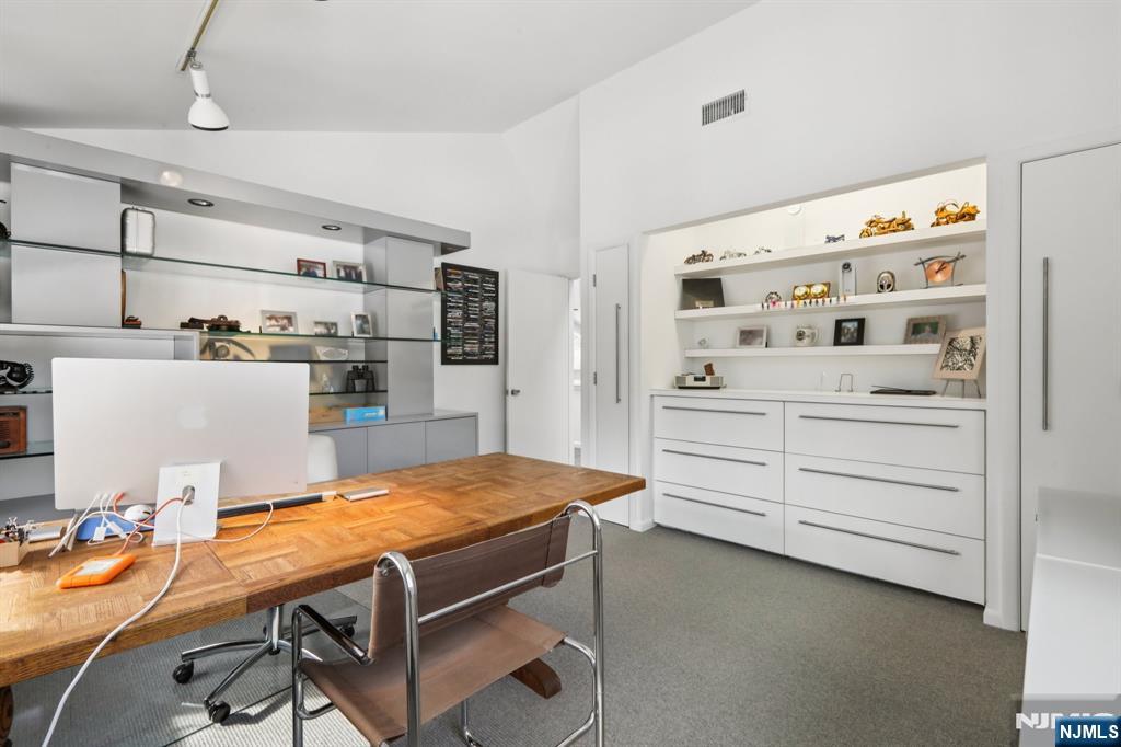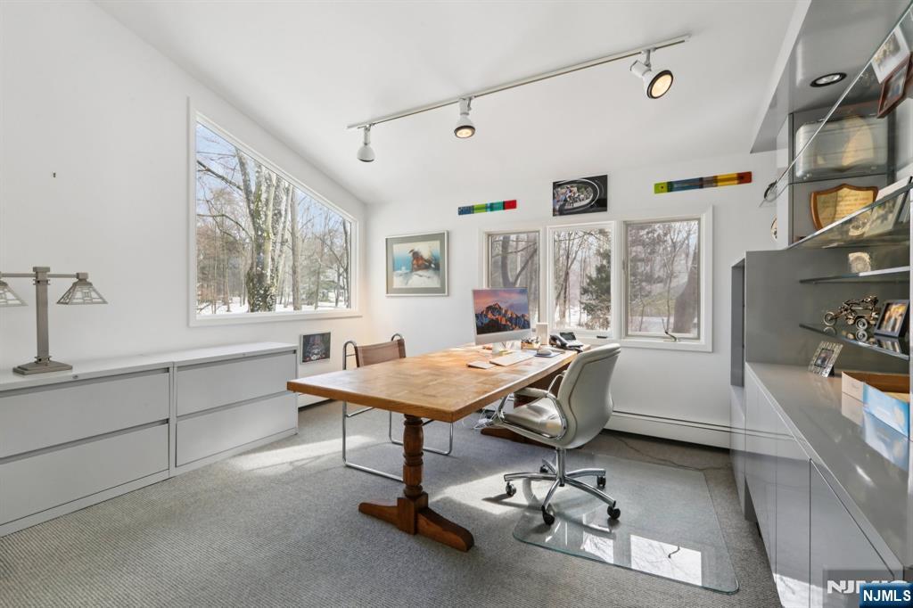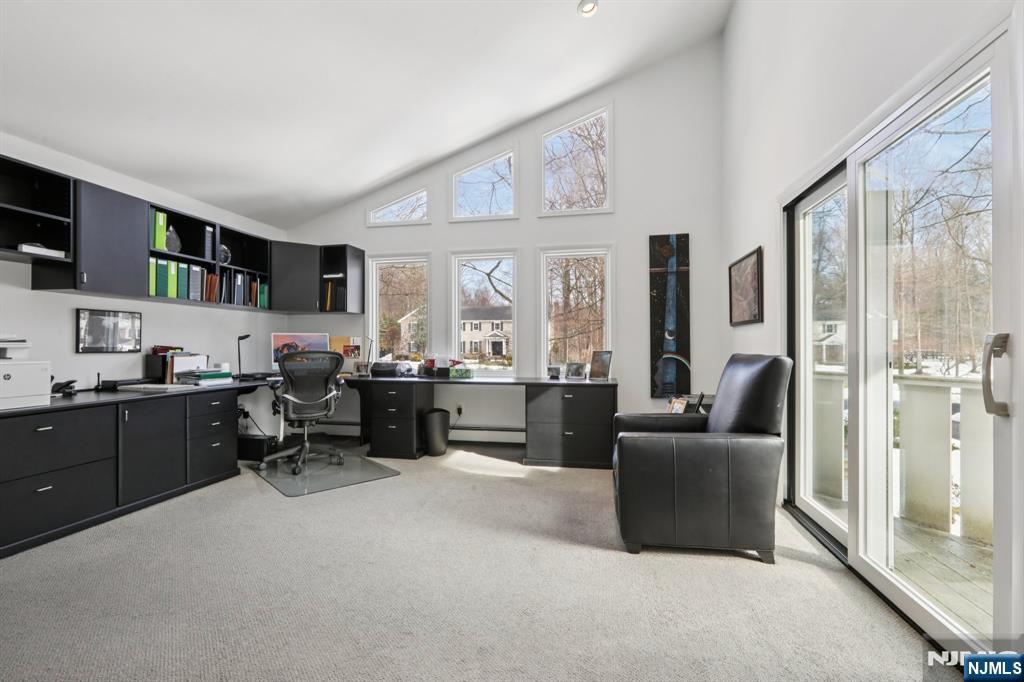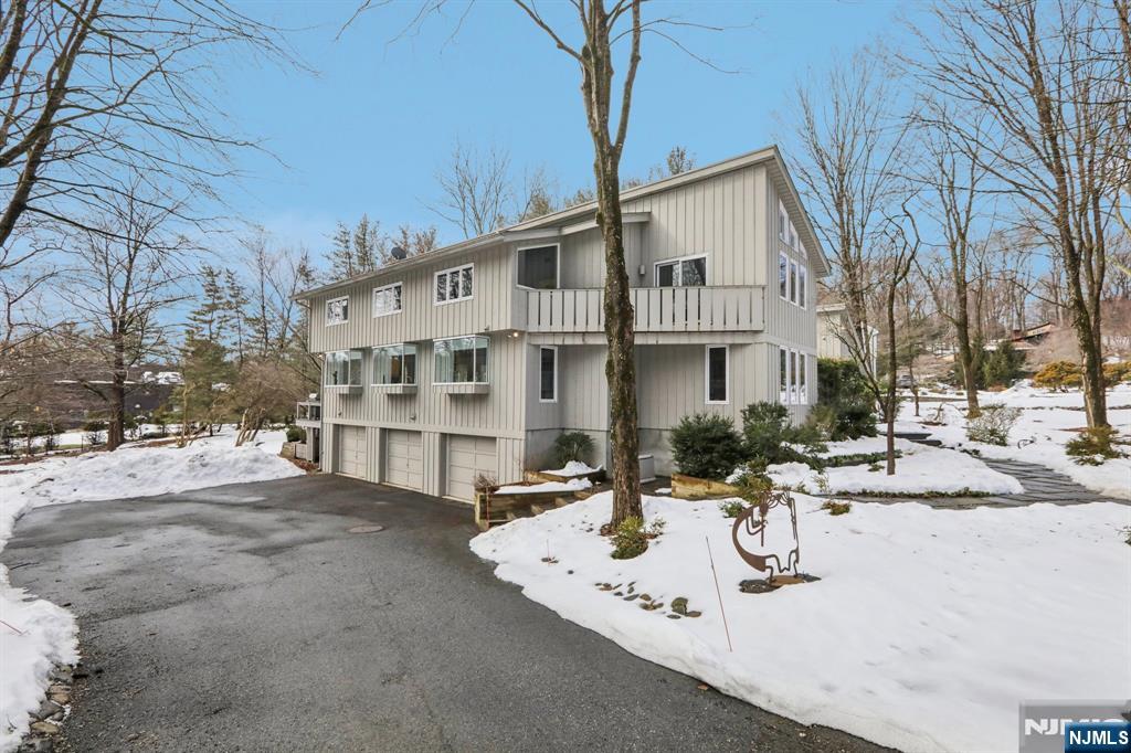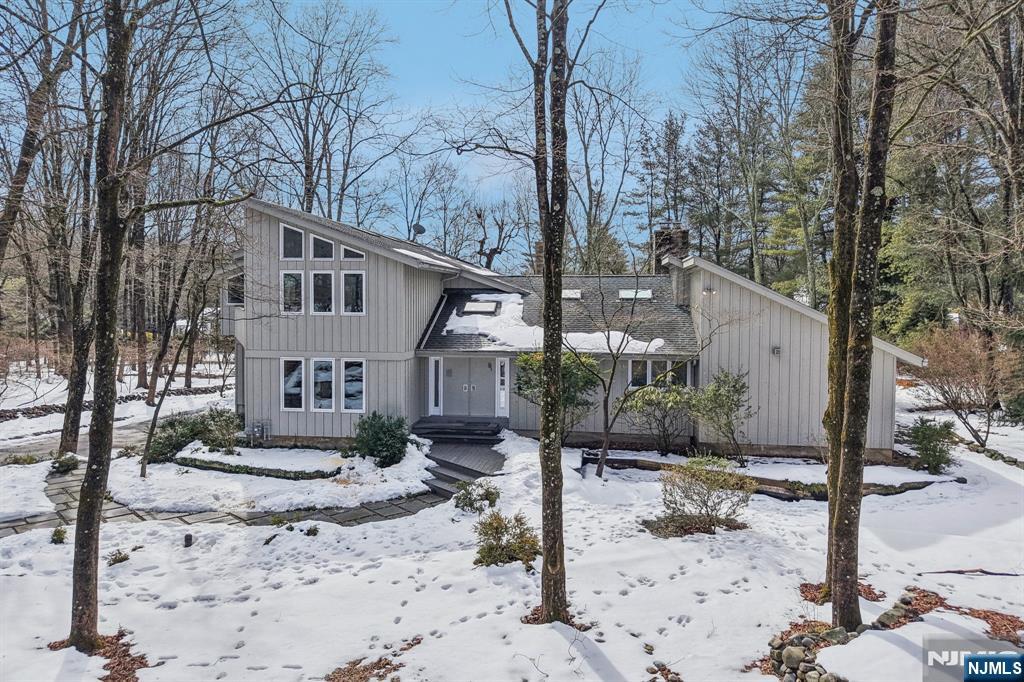 Set in a premier Upper Saddle River location, this custom home offers exceptional craftsmanship, comfort, and timeless appeal. Cathedral ceilings, large sun-filled windows, and elegant custom details create a warm yet sophisticated atmosphere throughout. The custom kitchen features oak cabinetry, an induction cooktop, Sub-Zero refrigerator, KitchenAid microwave/oven, built-in breakfast nook, and adjoining laundry/mudroom. Multiple sliding glass doors lead to an expansive deck and serene koi pond, creating an effortless indoor-outdoor flow for entertaining. The first-floor primary suite includes a beautifully appointed bath with double vanities and an oversized dual-outlet shower. Additional highlights include a three-floor elevator, three fireplaces, custom built-ins, and an integrated entertainment center. Upstairs, a library with built-in bookshelves and a dedicated office with custom workstations add charm and functionality. A full unfinished basement with built-in workbench, second washer/dryer, and a three-car garage complete this distinctive offering. Designed for both elegant entertaining and everyday ease, this is a home that feels as remarkable as it looks; warm, refined, and ready to be experienced in person.