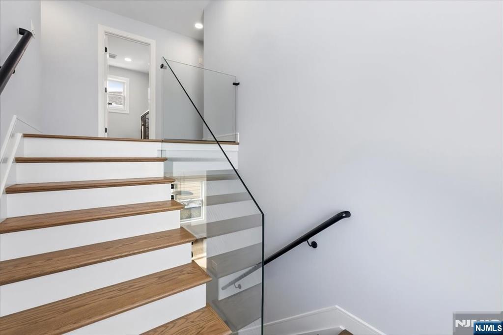 Beautifully crafted custom modern home offering a desirable no-step entry and thoughtfully designed living spaces throughout. The main level features an open-concept layout where the living, dining, and kitchen areas flow seamlessly together, creating a bright and inviting atmosphere ideal for everyday living and entertaining. The two-tone custom kitchen showcases quality wood cabinetry with soft-close drawers, dedicated spice storage, quartz countertops, classic subway tile backsplash, recessed lighting, and Samsung stainless appliances including microwave, dishwasher, and stove. An impressive 8-foot sliding door opens to an expansive paver patio extending approximately 46 feet, perfect for outdoor gatherings. Upstairs, four spacious bedrooms provide comfortable accommodations, including a primary suite featuring a large walk-in closet with California Closets and a private bath. One secondary bedroom offers its own en-suite bath with stall shower, while the remaining bedrooms include generous double closets and easy access to the full hall bath. A dedicated laundry room with cabinetry and folding counter adds everyday convenience. Additional highlights include Anderson windows, Navien tankless water heater, two-zone forced air and central systems, 200-amp electrical service, EV charging connector in garage and a 25-year asphalt shingle roof. The attic offers extensive plywood flooring for storage. Property includes a paver patio, level side and backyard, survey available.