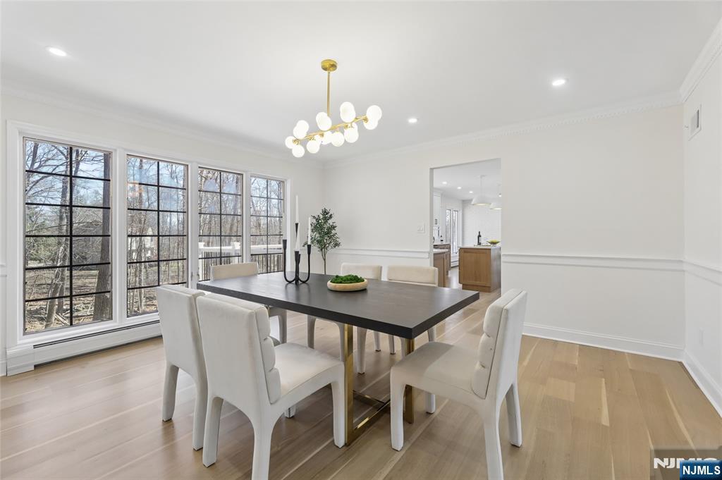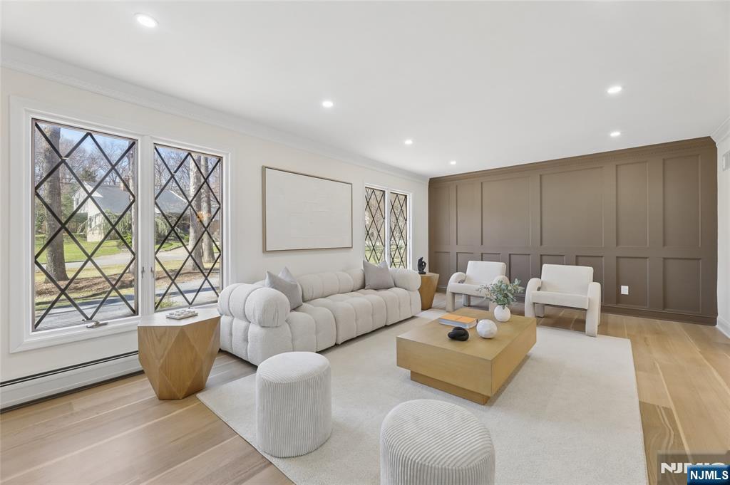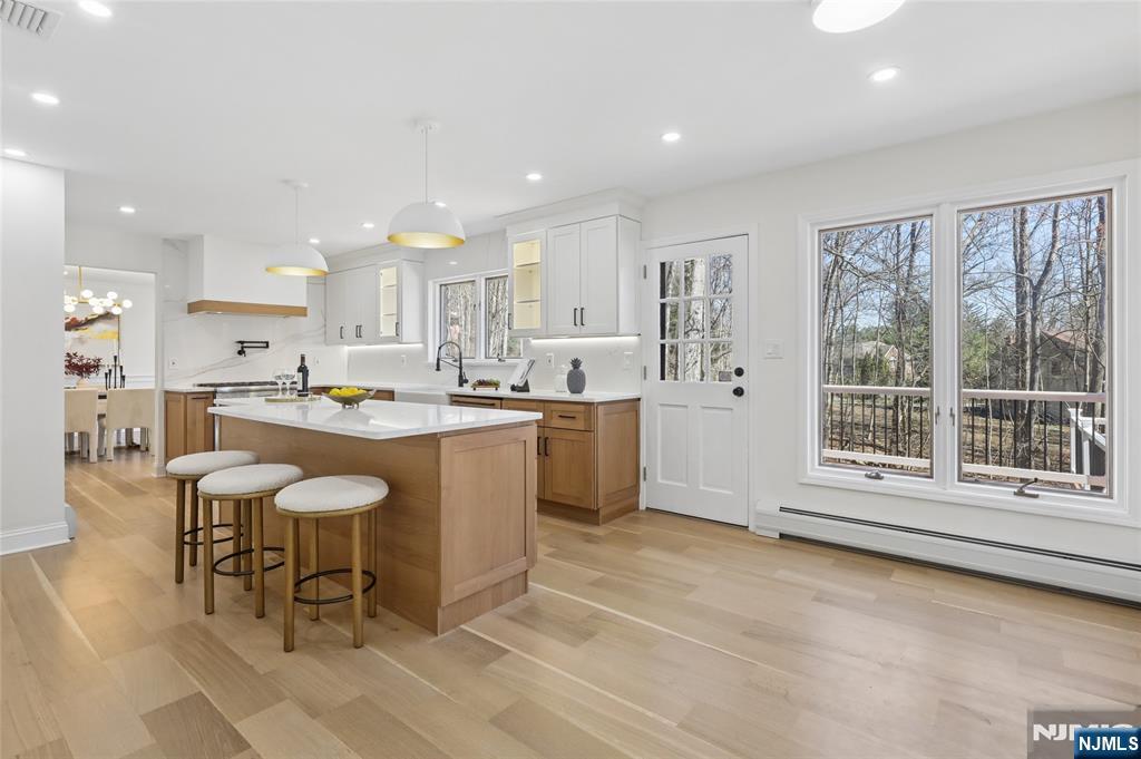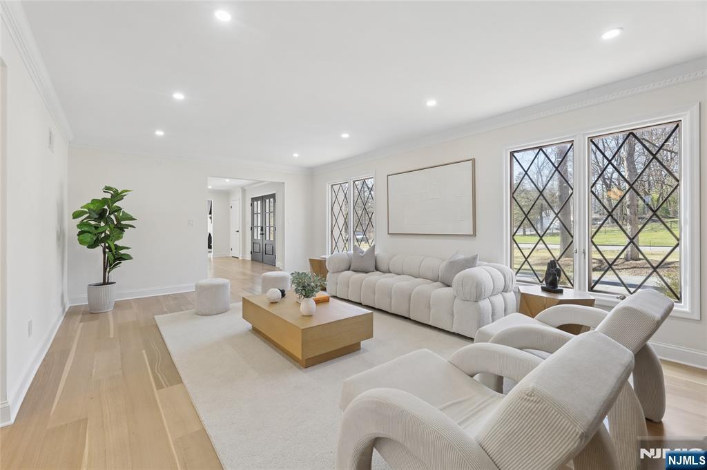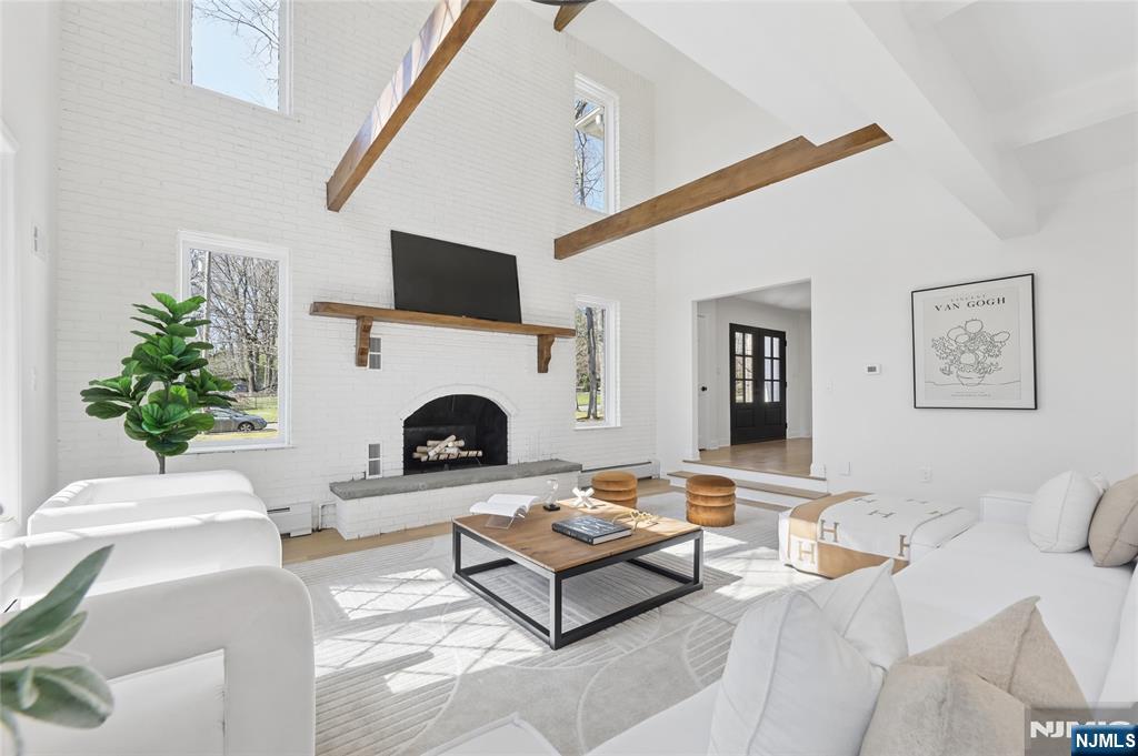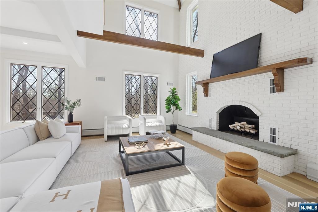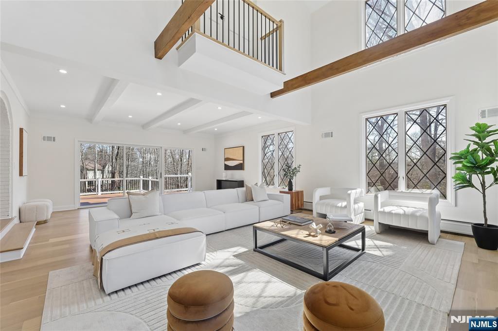 Set on a quiet dead-end street in Franklin Lakes, this fully renovated colonial offers privacy, scale, and standout design. A double French door entry opens to a welcoming foyer that leads into a true great room with double-height ceilings, exposed beams, and a full brick wood-burning fireplace wall. Oversized sliding doors extend the space to a large composite deck, creating seamless indoor-outdoor flow. The kitchen is built for both function and presence, featuring white oak cabinetry, high-end appliances, and a built-in 48â€Â쳌 refrigerator. Formal dining and living rooms sit just off the main living space, along with a well-designed powder room. Wide-plank 7â€Â쳌 rift and quartered white oak floors run throughout the home, complemented by abundant natural light from oversized windows. Upstairs, the dream primary suite is positioned for impact and privacy, offering generous proportions, a Juliet balcony overlooking the great room, a huge custom walk-in closet, and a distinctive wet room-style bathroom. Three additional bedrooms, a full bath, and a second-floor laundry room complete the level. The walkout basement adds significant usable space with a massive rec area and soaring ceilings, ideal for a variety of uses. The property is set on a picturesque 1-acre lot with a U-shaped driveway and a charming pond, offering both curb appeal and a unique outdoor setting.