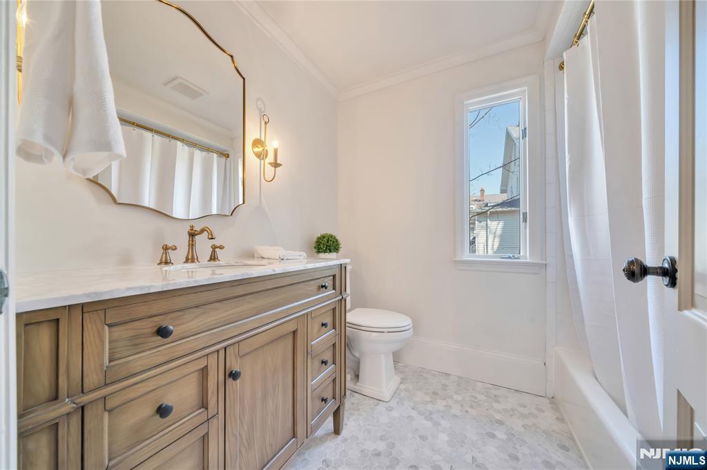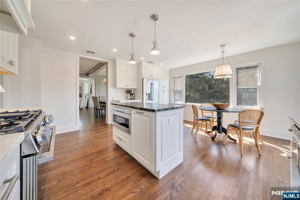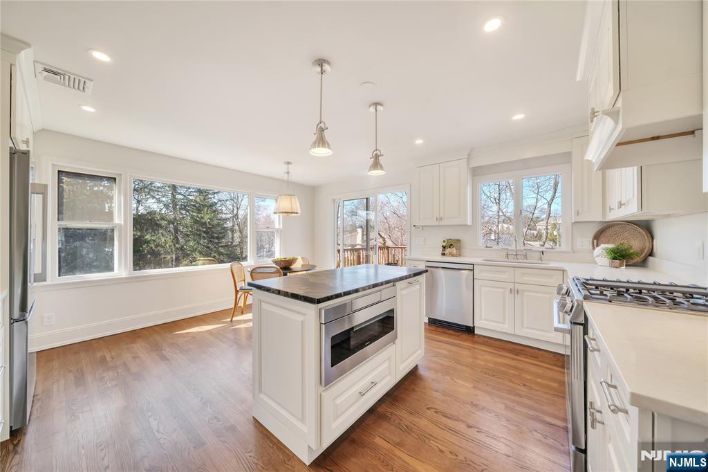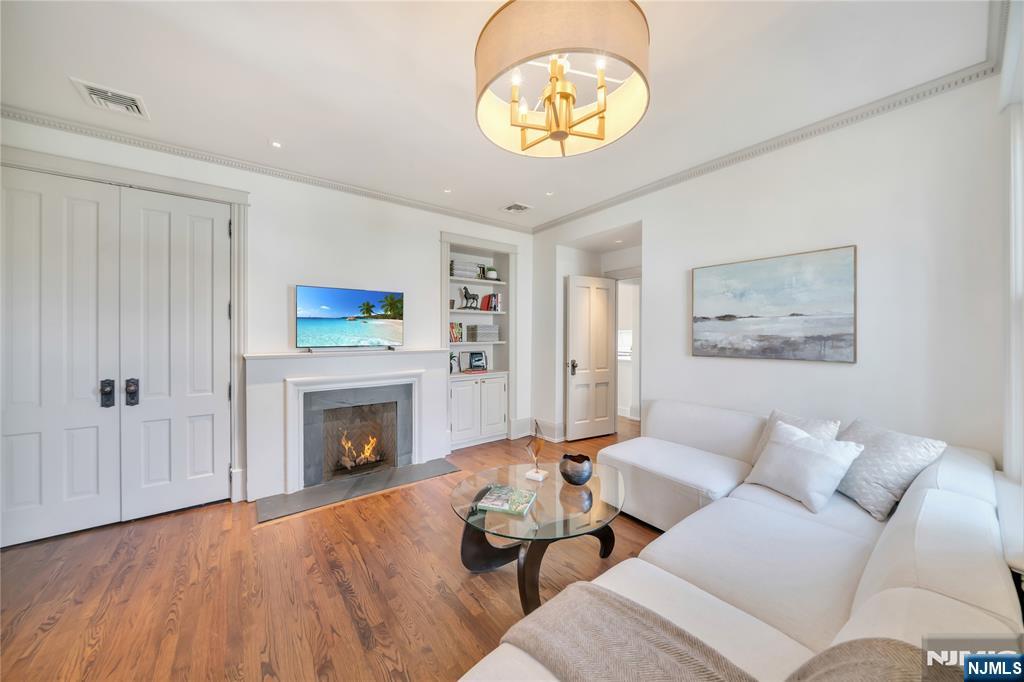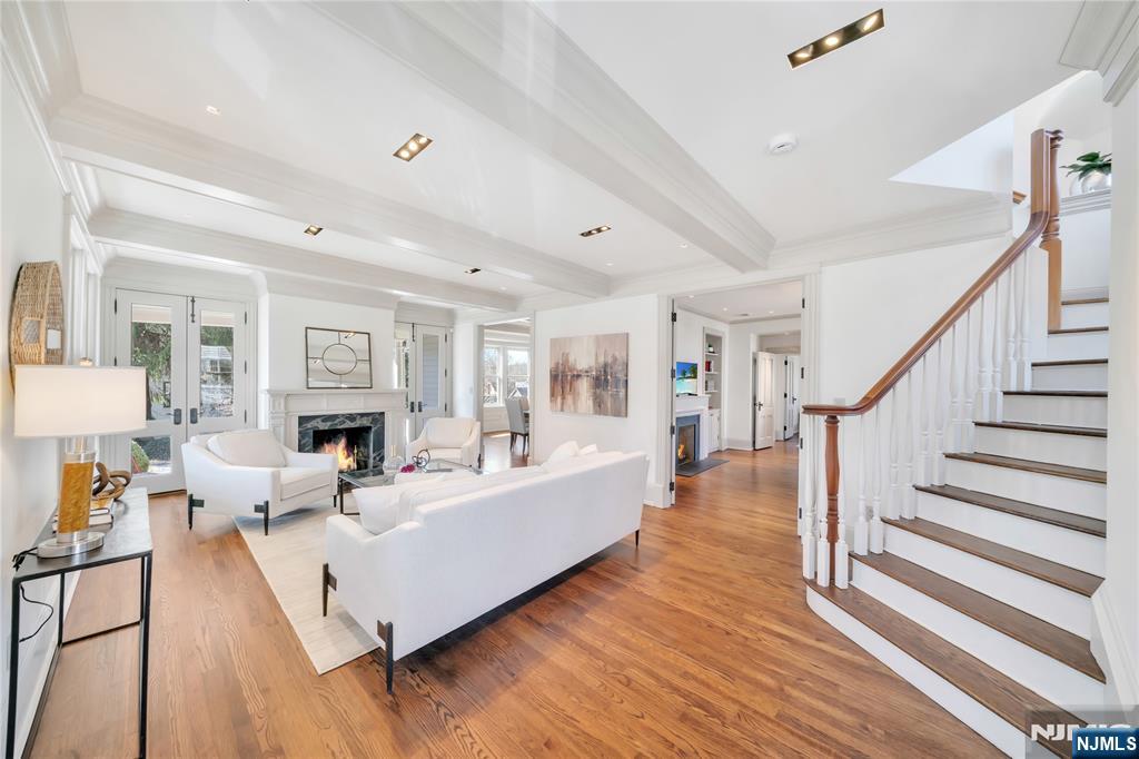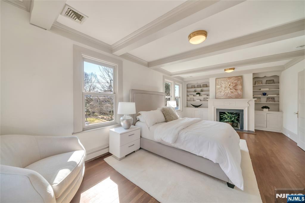 Welcome to this turn of the century Colonial, showcasing timeless architecture and thoughtful updates throughout. A gracious wraparound porch sets the stage, while new oak flooring on the main level, updated bathrooms, and beautiful millwork enhance the home’s classic appeal. The formal living room features a fireplace and French doors opening to the side porch, creating a seamless flow for indoor outdoor living. The family room with fireplace offers an inviting gathering space, while the banquet sized dining room leads to a renovated kitchen appointed with new cabinetry, stainless steel appliances, and a blend of quartz and granite countertops. A convenient first-floor guest bedroom or office and a fully updated bath complete this level. Upstairs, the second floor includes a charming bedroom with fireplace and built-ins, two additional bedrooms, and an updated hall bath. The third level is dedicated to a private primary suite featuring an ensuite bathroom, walk-in closet, and laundry area. A detached three car garage adds exceptional convenience. Ideally located near NYC transportation, schools, shopping, and all that the Village of Ridgewood has to offer, this home perfectly blends timeless character with modern comfort.