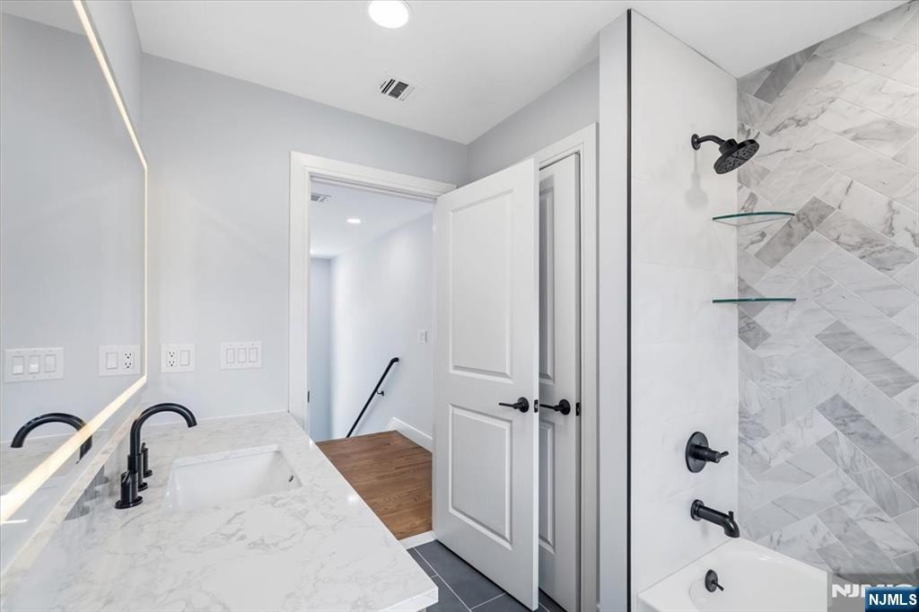 Beautifully crafted custom modern home offering a desirable no-step entry and thoughtfully designed living spaces throughout. The main level features an open-concept layout where the living, dining, and kitchen areas flow seamlessly together, creating a bright and inviting atmosphere ideal for everyday living and entertaining. The two-tone custom kitchen showcases quality wood cabinetry with soft-close drawers, dedicated spice storage, quartz countertops, classic subway tile backsplash, recessed lighting, and Samsung stainless appliances including microwave, dishwasher, and stove. An impressive 8-foot sliding door opens to an expansive paver patio extending approximately 46 feet, perfect for outdoor gatherings. Upstairs, four spacious bedrooms provide comfortable accommodations, including a primary suite featuring a large walk-in closet with California Closets and a private bath. One secondary bedroom offers its own en-suite bath with stall shower, while the remaining bedrooms include generous double closets and easy access to the full hall bath. A dedicated laundry room with cabinetry and folding counter adds everyday convenience. Additional highlights include Anderson windows, Navien tankless water heater, two-zone forced air and central systems, 200-amp electrical service, EV charging connector in garage and a 25-year asphalt shingle roof. The attic offers extensive plywood flooring for storage. Property includes a paver patio, level side and backyard, survey available.